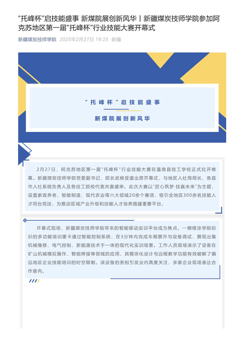 “托峰杯”启技能盛事 新煤院展创新风华丨新疆煤炭技师学院参加阿克苏地区第一届“托峰杯”行业技能大赛开幕式 来源: 发布时间:2025-11-01 15:55:04 浏览次数: 次 【字体:小 大】 分享到: 【打印正文】