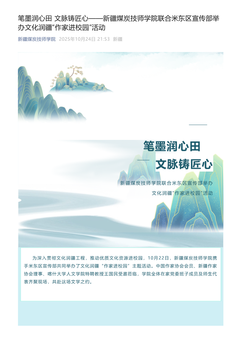笔墨润心田 文脉铸匠心——新疆煤炭技师学院联合米东区宣传部举办文化润疆“作家进校园”活动